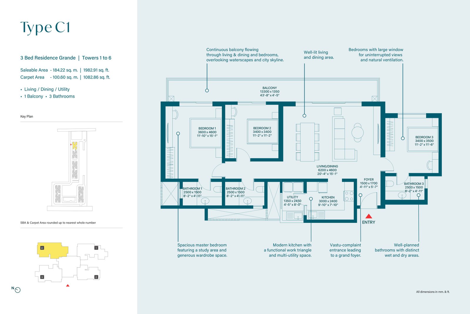 The architecture of Sobha Rivana Sector 1 Noida Extension is a testament to sophisticated design and meticulous planning, aiming to maximize light, space, and functionality. The towering structures, reaching G+45 floors, are set to become architectural landmarks, symbolizing the modern, vertical city life. Thoughtful Configurations and Spacious Layouts.Sobha Rivana offers a range of configurations designed to meet diverse family needs, all sharing the common thread of luxury and spaciousness: 2 BHK Luxury Apartments: Starting at approximately 1300 sq. ft. 3 BHK Apartments: Available in multiple sizes, around 1600 sq. ft. to 1850 sq. ft. 4 BHK Residences: The most expansive units, ranging from 2200 sq. ft. to 2500 sq. ft.